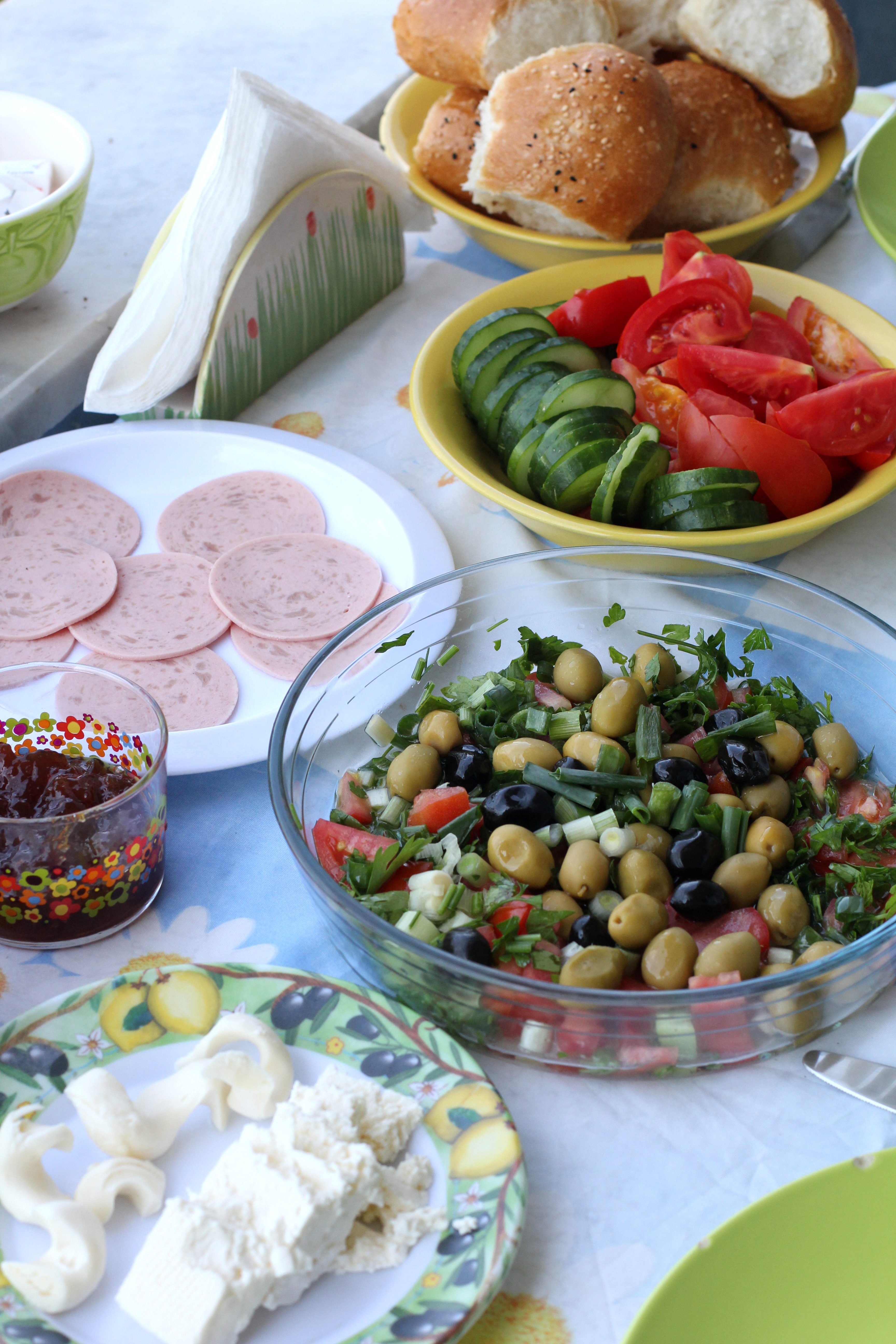 Along with plentiful vegetables come perfect breakfasts. Breakfast was one of my favorite aspects of German culture, especially on the weekends. I must say, outside of the cheese and bread selection, Turkey might even do a better job. Here we include tomatoes, cucumbers, olives, cheeses, eggs, meats and bread on our breakfast table. And Turkish tea and coffee, of course.