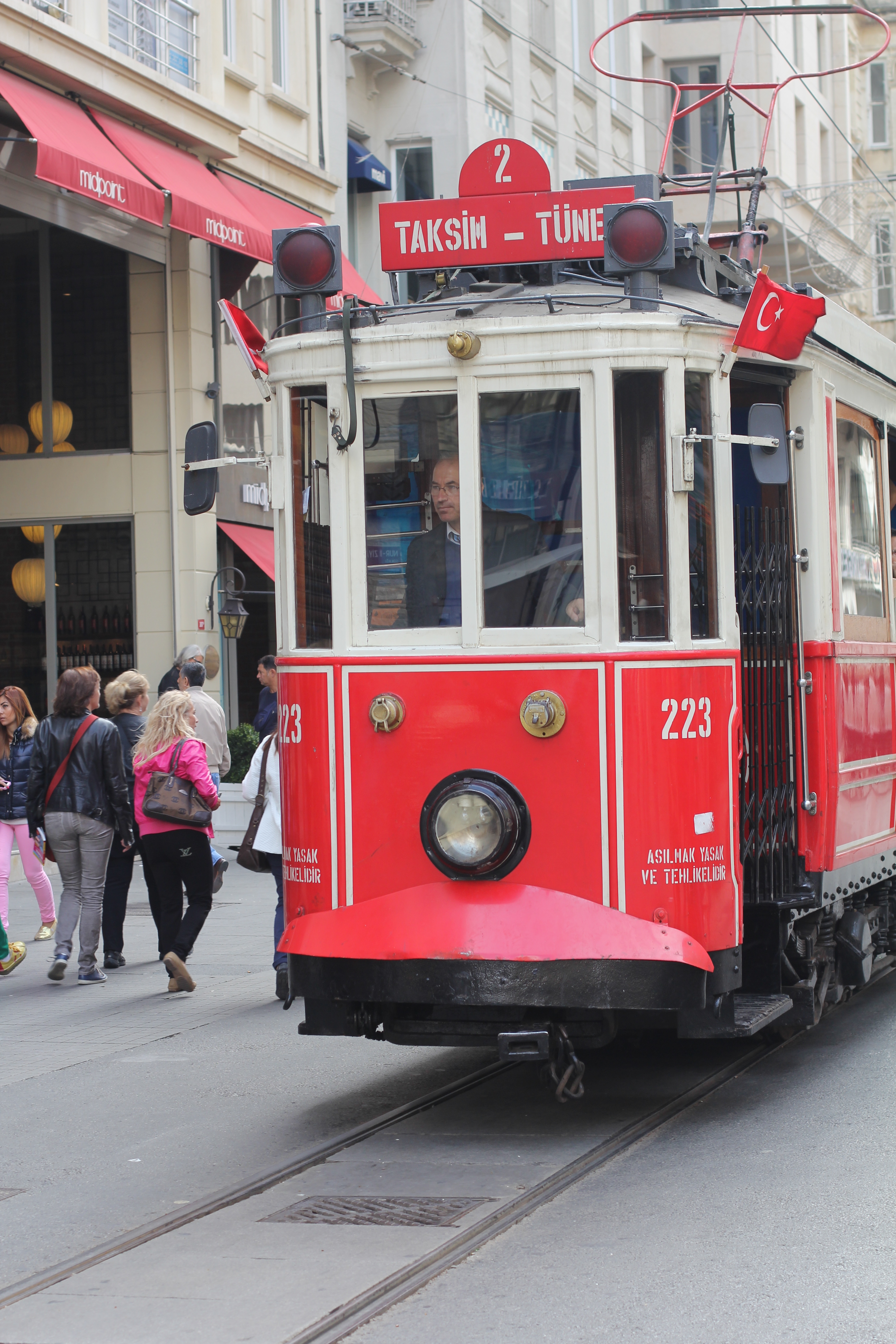 A street car runs up and down Istiklal Street